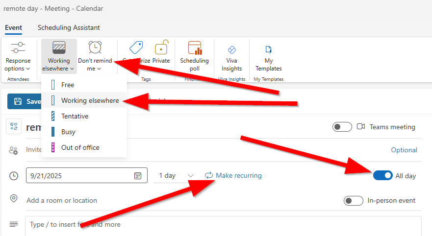 To post your remote work schedule, create an appointment on your Outlook calendar; set it to be an all-day appointment, and set the Free/Busy type to: Working elsewhere. Then, click on the Make recurring link & schedule this appointment to run for the duration of your flexible work plan.